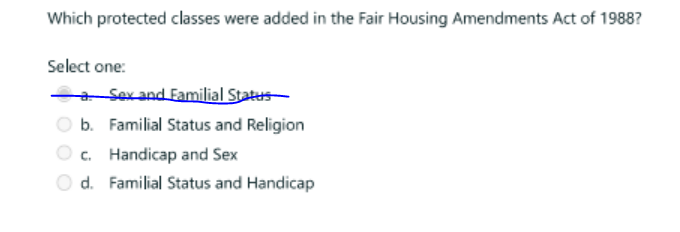 As amended in 1988 the Fair Housing Act prohibits discrimination on the basis of 7 protected classes. Which protected classes were added in the Fair Housing Amendments. The fair housing protected classes are familial status.